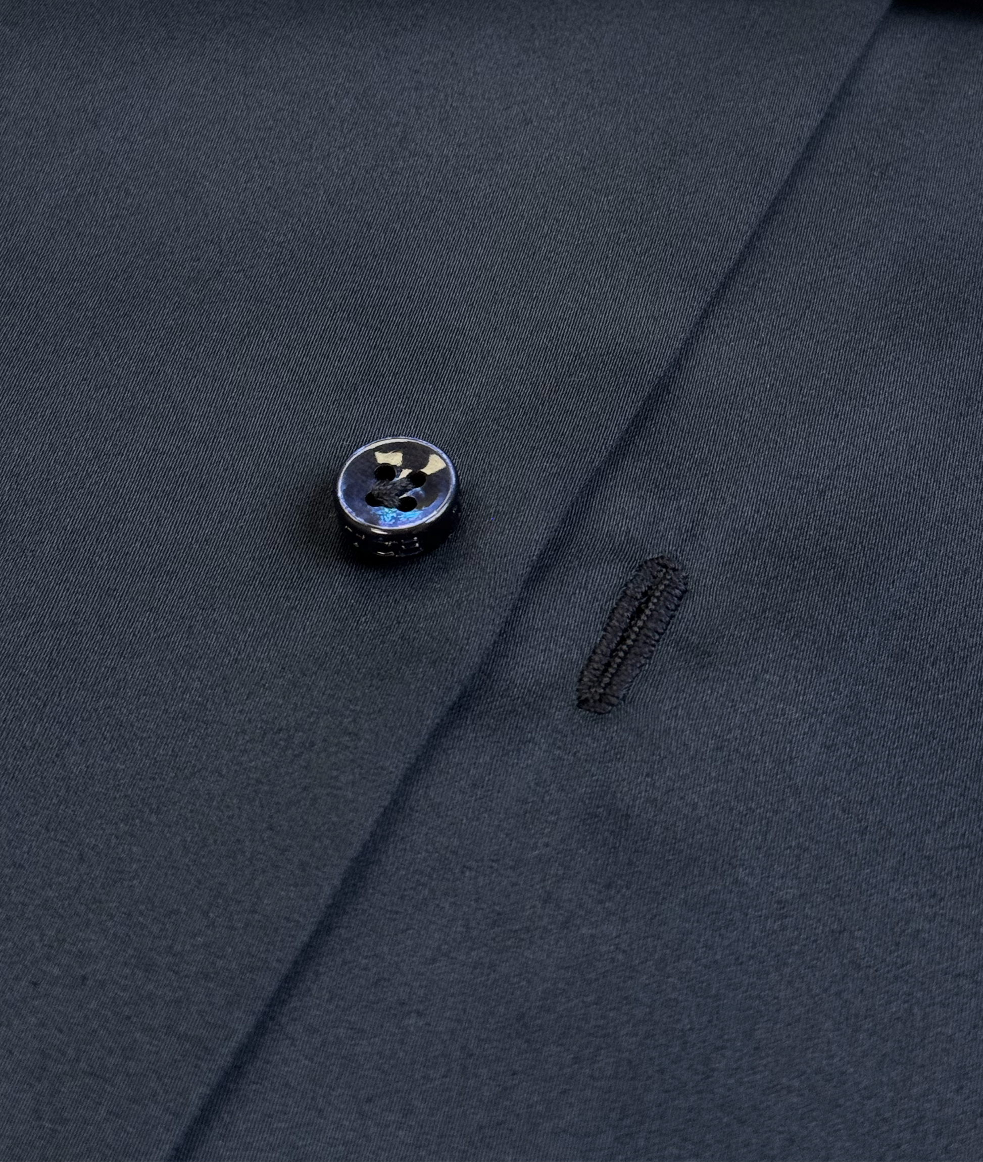 Midnight blue cotton sateen dress shirt in our signature style and tailored fit, with fine and controlled shirring across the back for aesthetic and ease of movement.